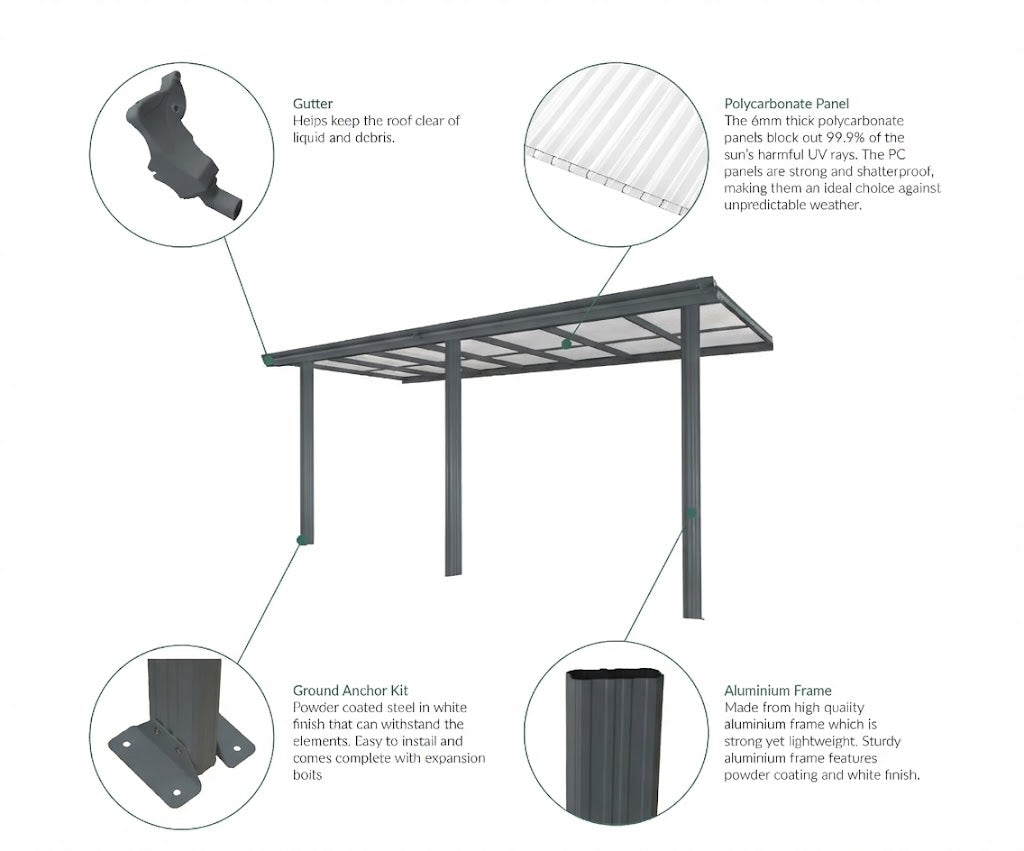 This Primrose Veranda Garden Canopy is the perfect pair for your patio, allowing you to make the most out of your garden. Alternatively, you can also use it as a carport to protect your vehicles. The Veranda Garden Canopy features a sturdy aluminium frame and shatterproof 6mm thick polycarbonate sheets that not only offers protection from mild weather conditions, but also blocks harmful UV rays. The rustproof, maintenance free aluminium frame ensures longevity of the garden canopy.