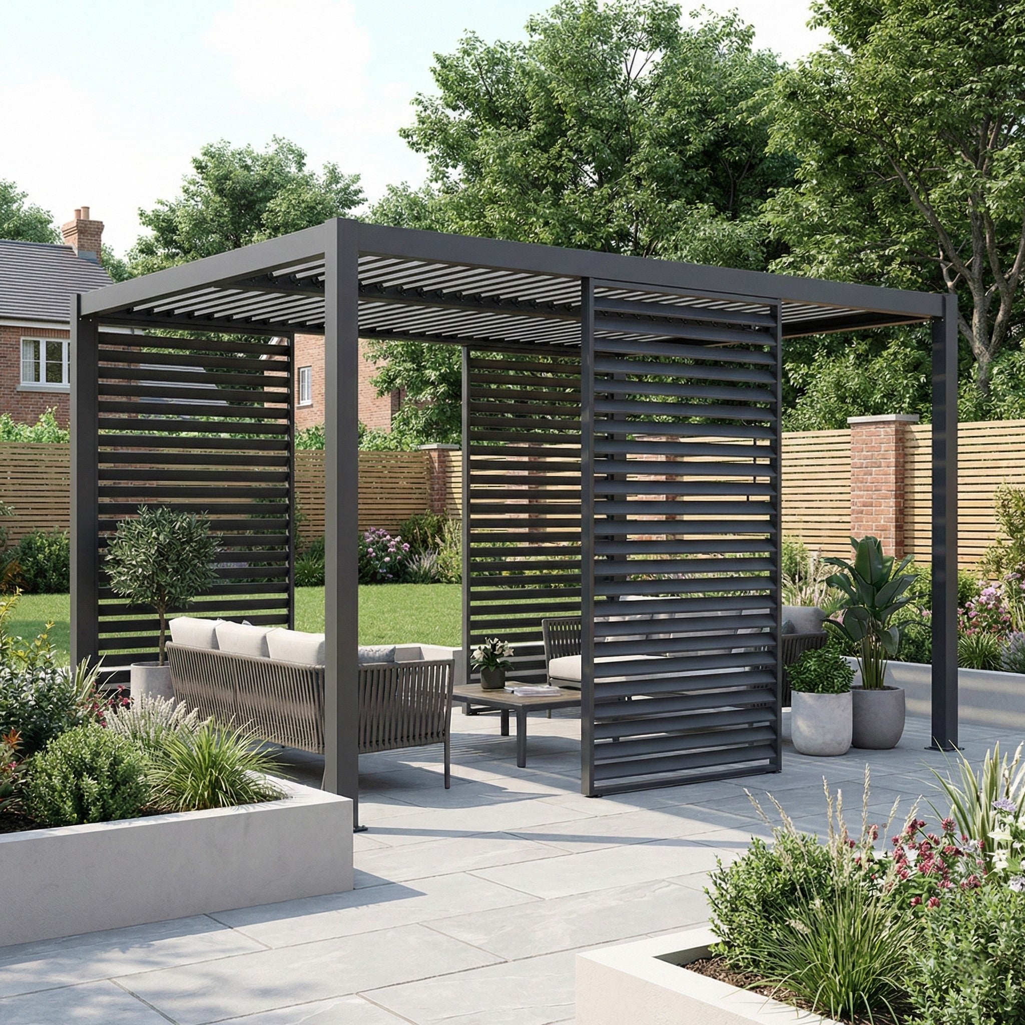 The fixed louvred design are set to a an angle that prevents visibility into the pergola from above, enhancing privacy.